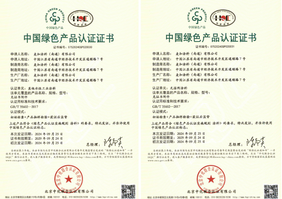 近日,經過一系列現場審查、抽樣送檢及復核評審,麥加芯彩9款涂料產品順利獲得由北京中化聯合認證有限公司頒發的綠色產品認證!此次認證涵蓋了風電涂料和集裝箱涂料兩大業務板塊。